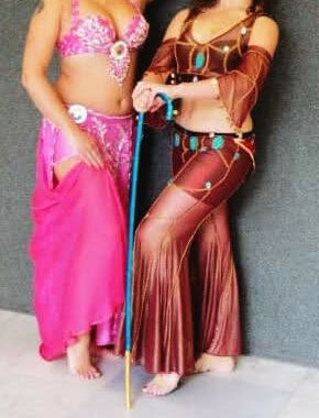 Kalhotový moderní kostým tmavé bordó barvy nese tyrkysové modré skaraby (scarabeus) a bohatě je vyšíván korálky. Kostým je vhodný na moderní tanec, egyptský orientální tanec, ale i na tanec s hůlkou.