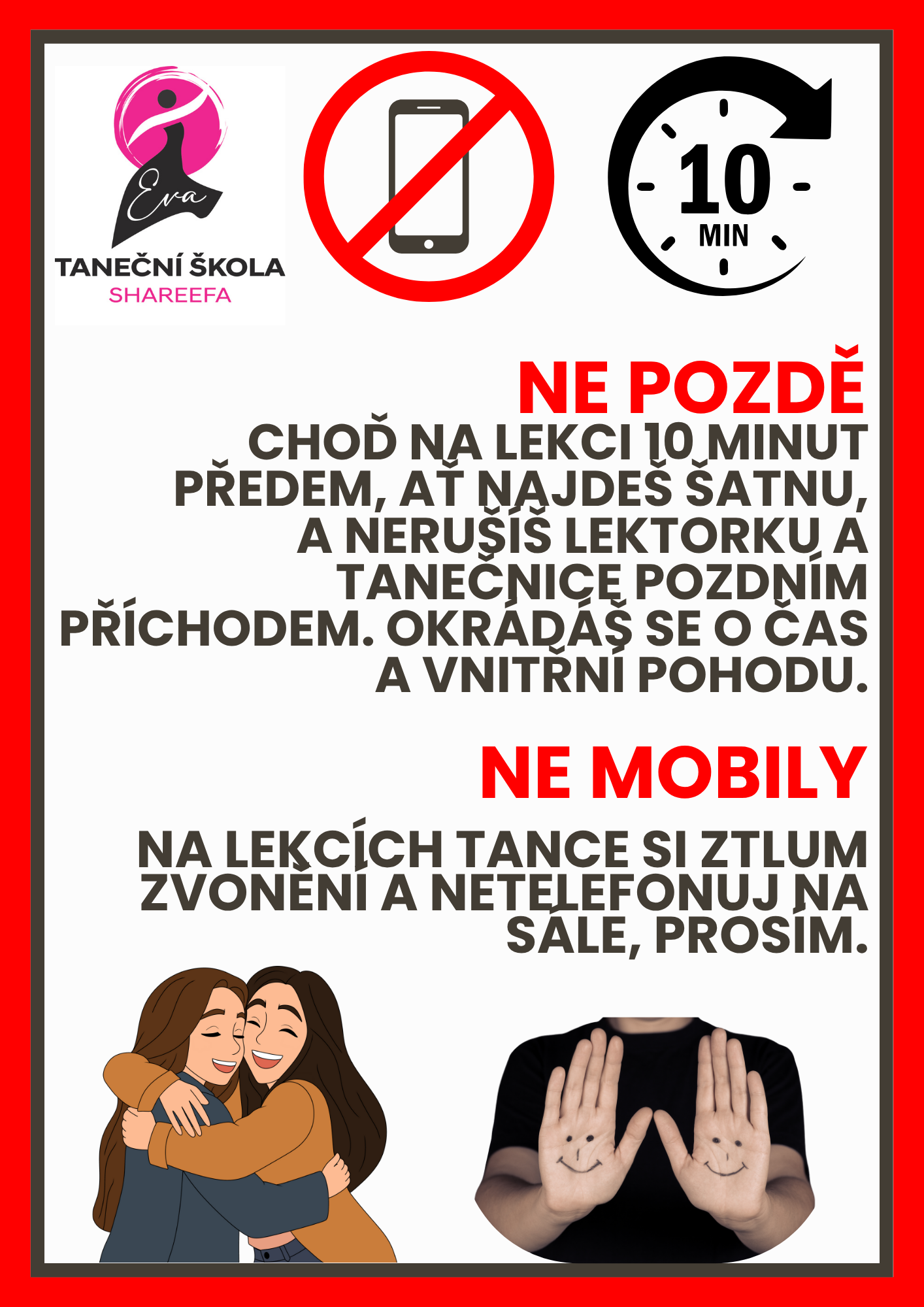 Před taneční lekcí si prosím striktně vypínejte (ztlumte) mobil, na hodině netelefonujte, ani jinak nevyrušujte výuku.